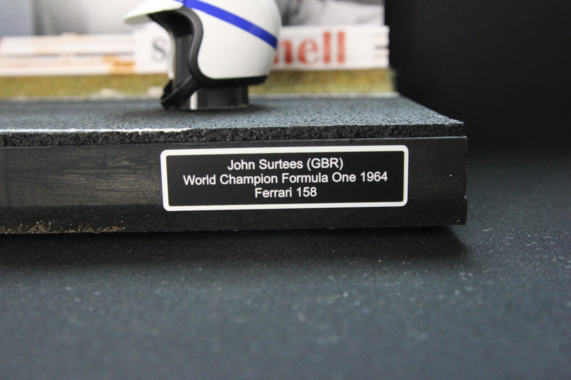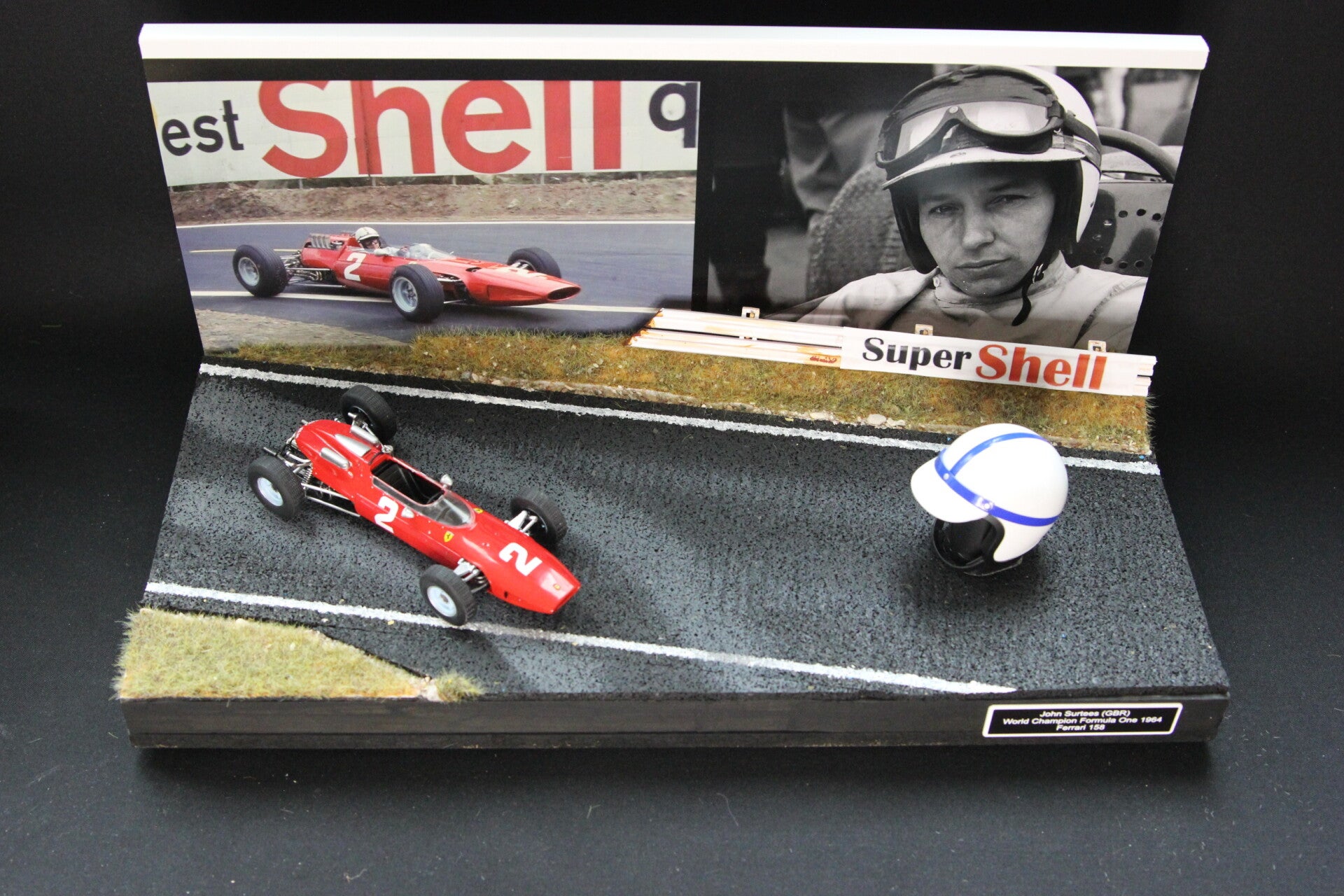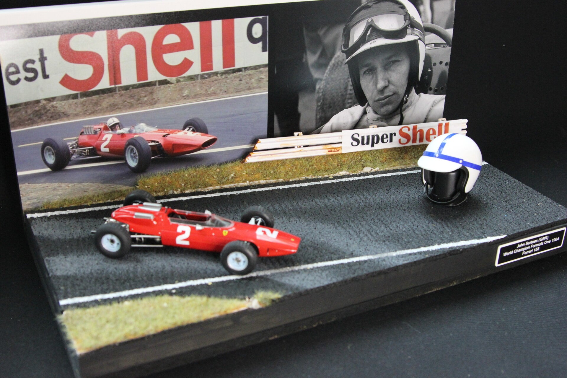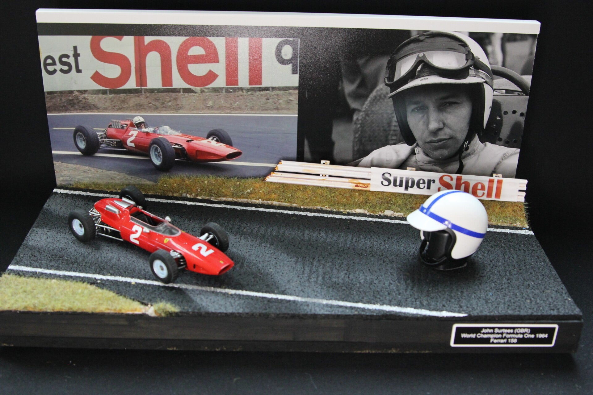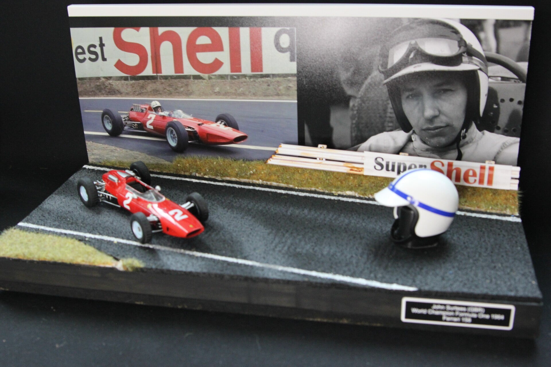This is a handmade diorama and comes with the 1:24 model of the 1964 Ferrari 158 and a model of the helmet of John in 1:5 scale
