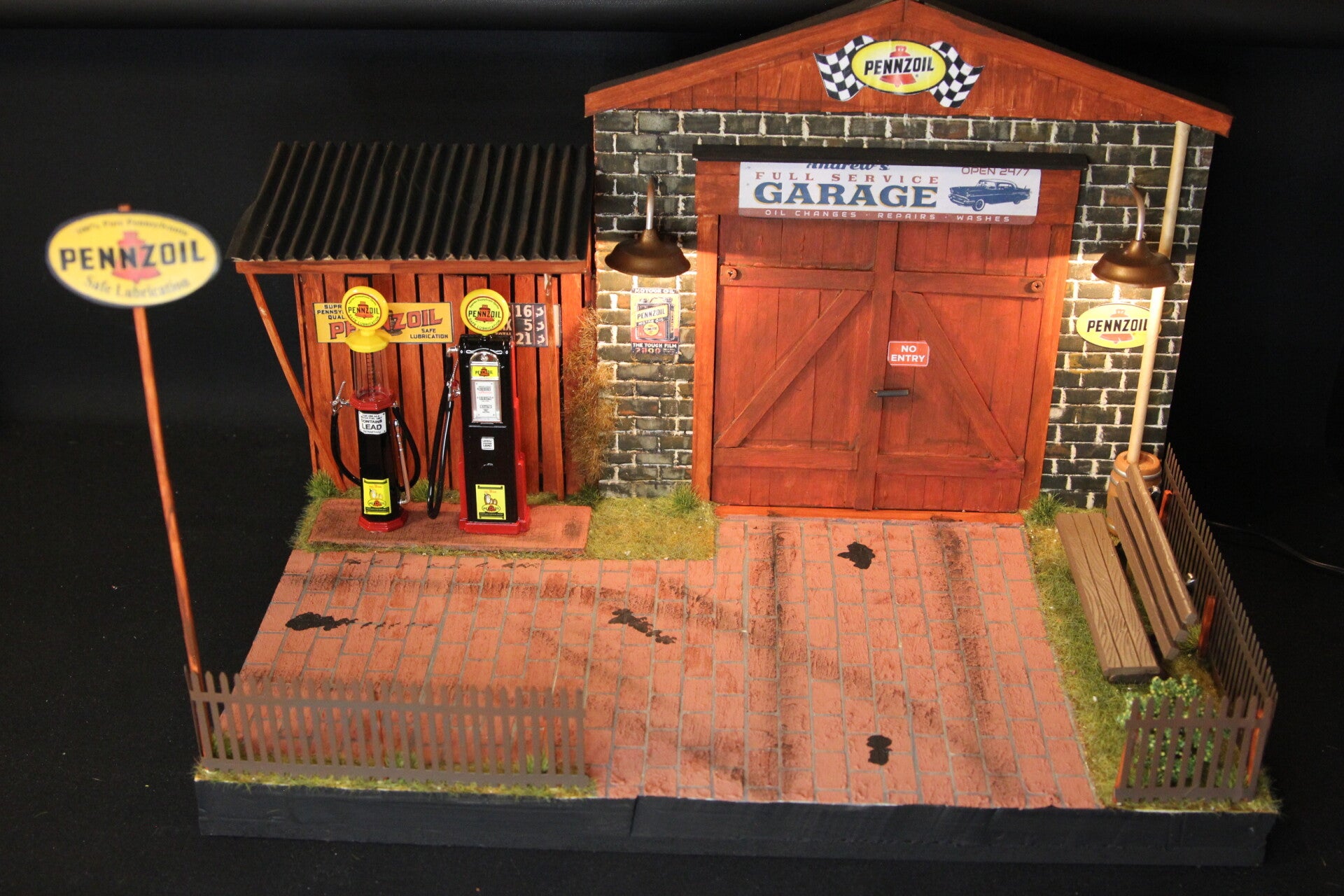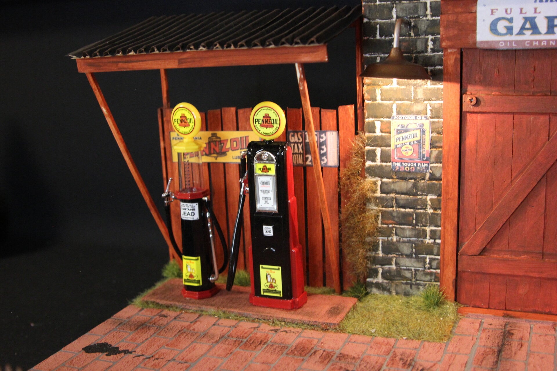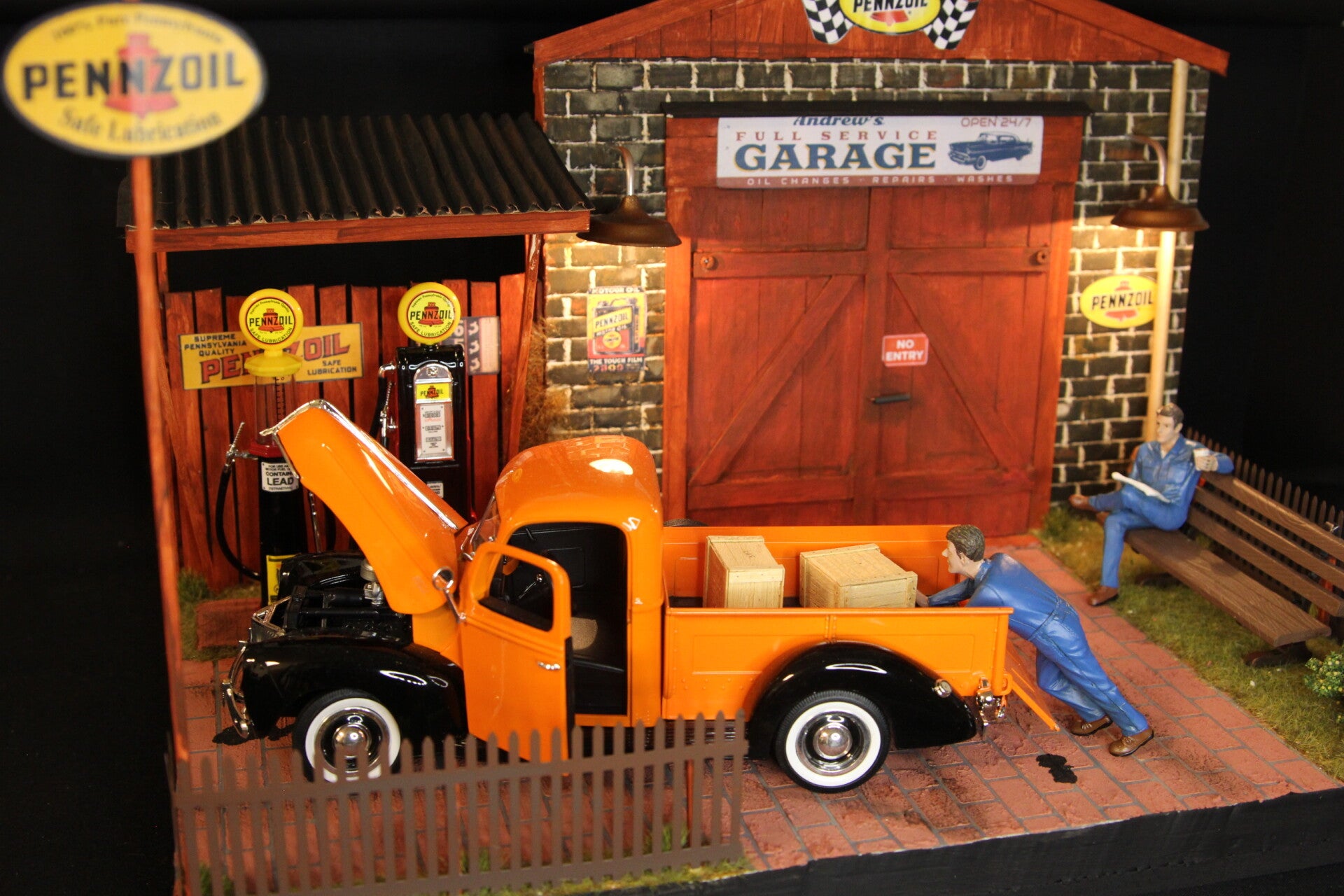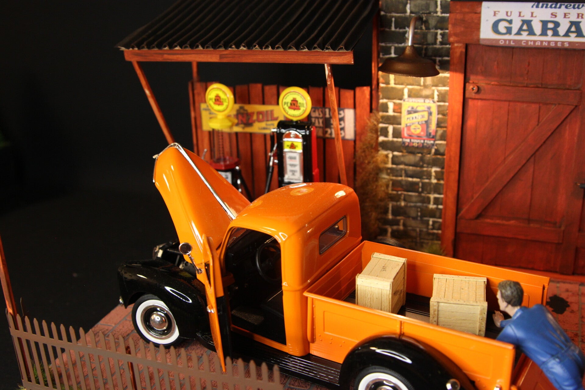 Diorama American Gas station (1960's) with Motor Max 1940 Ford Pickup 1:18