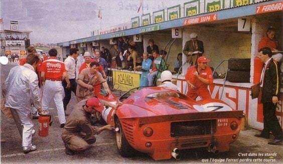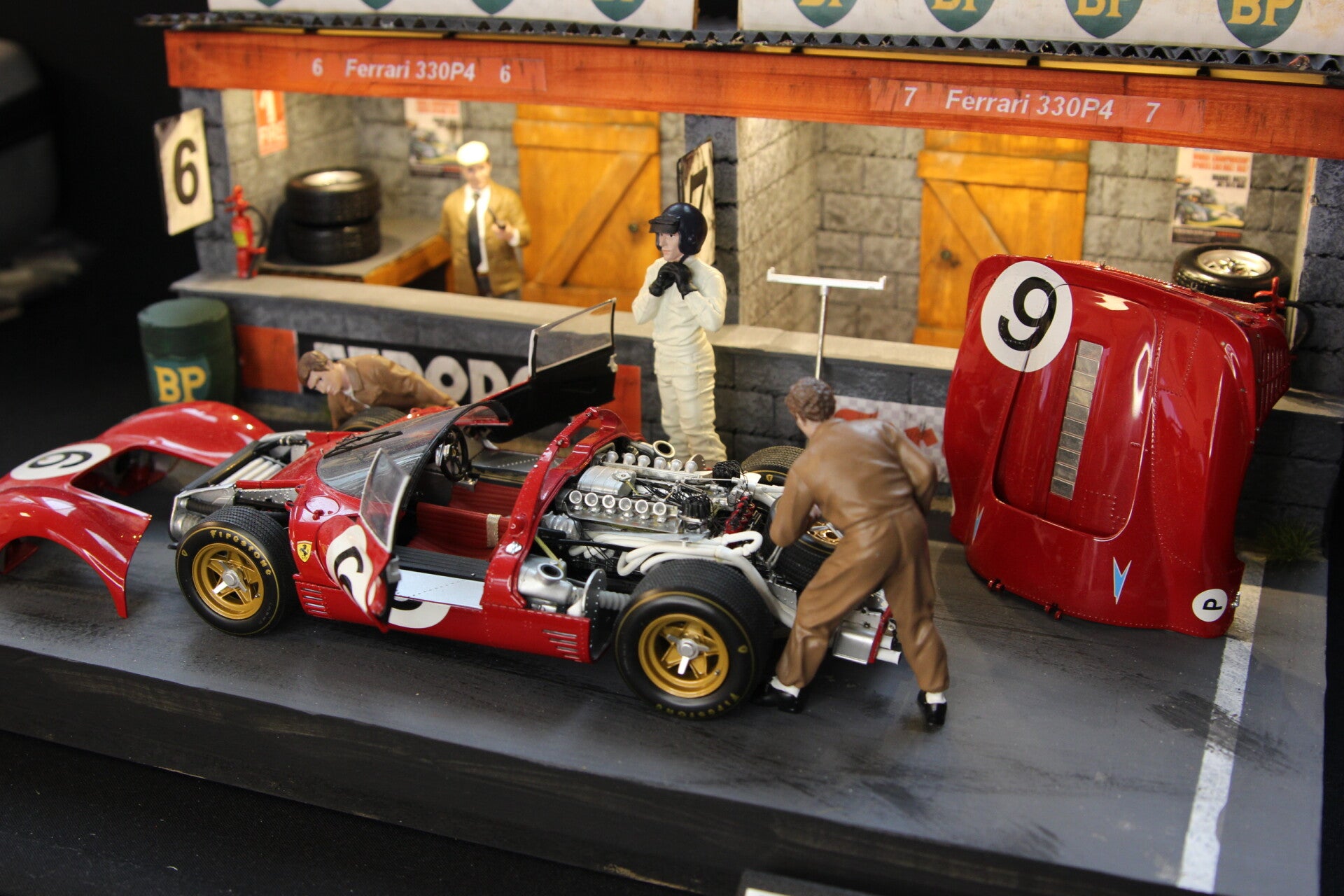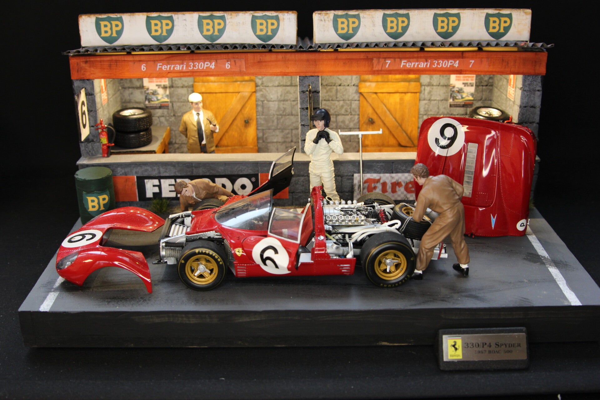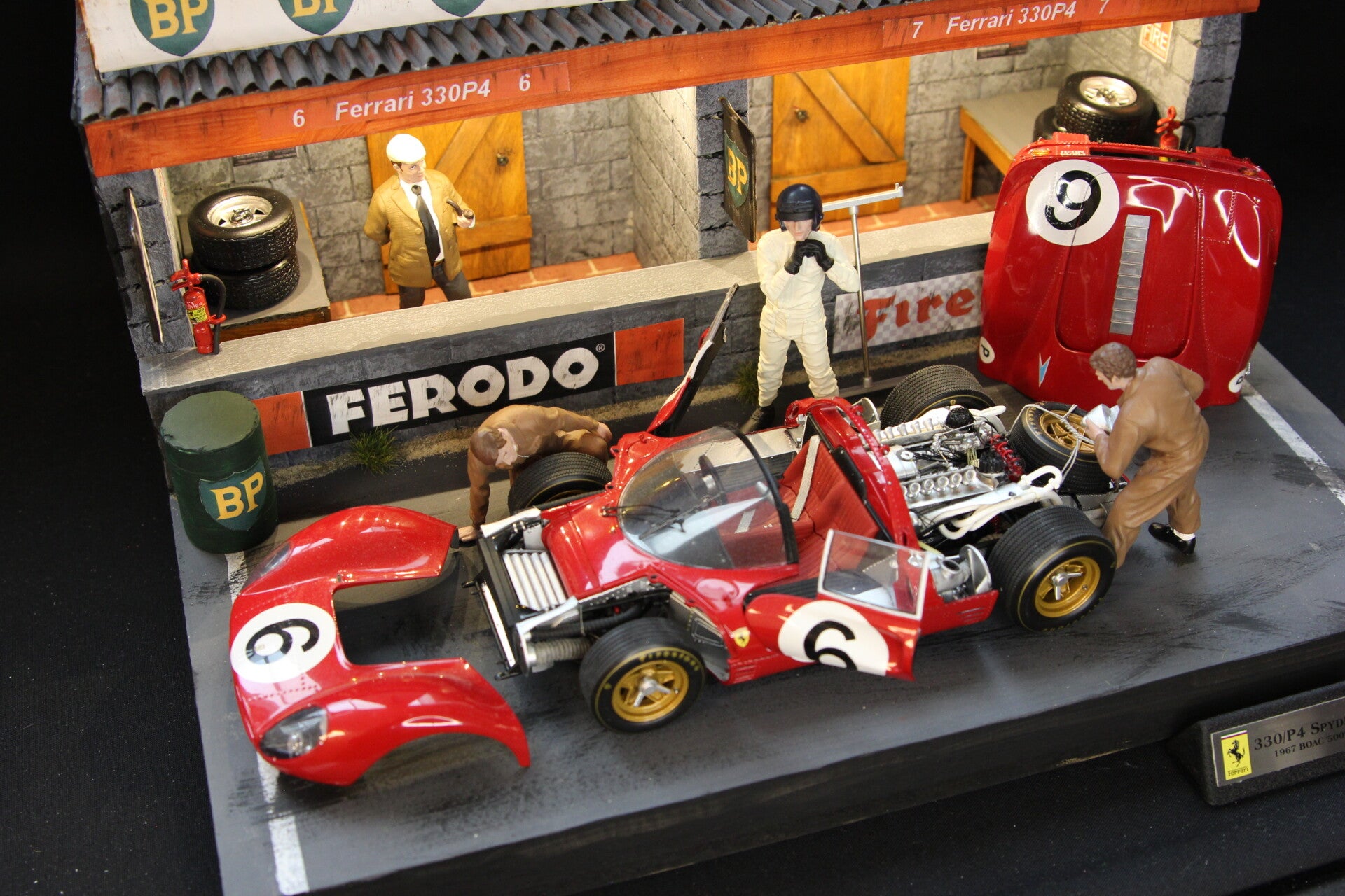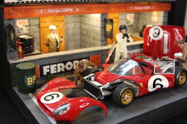 Het diorama wordt geleverd inclusief het zeer fraaie en gedetailleerde GMP model van de Team S.p.A. Sefac Ferrari 330 P4 met startnummer 6, gereden door Chrius Amon (NZL) en Jackie Stewart (GBR) die de 2e plaats behaalden.