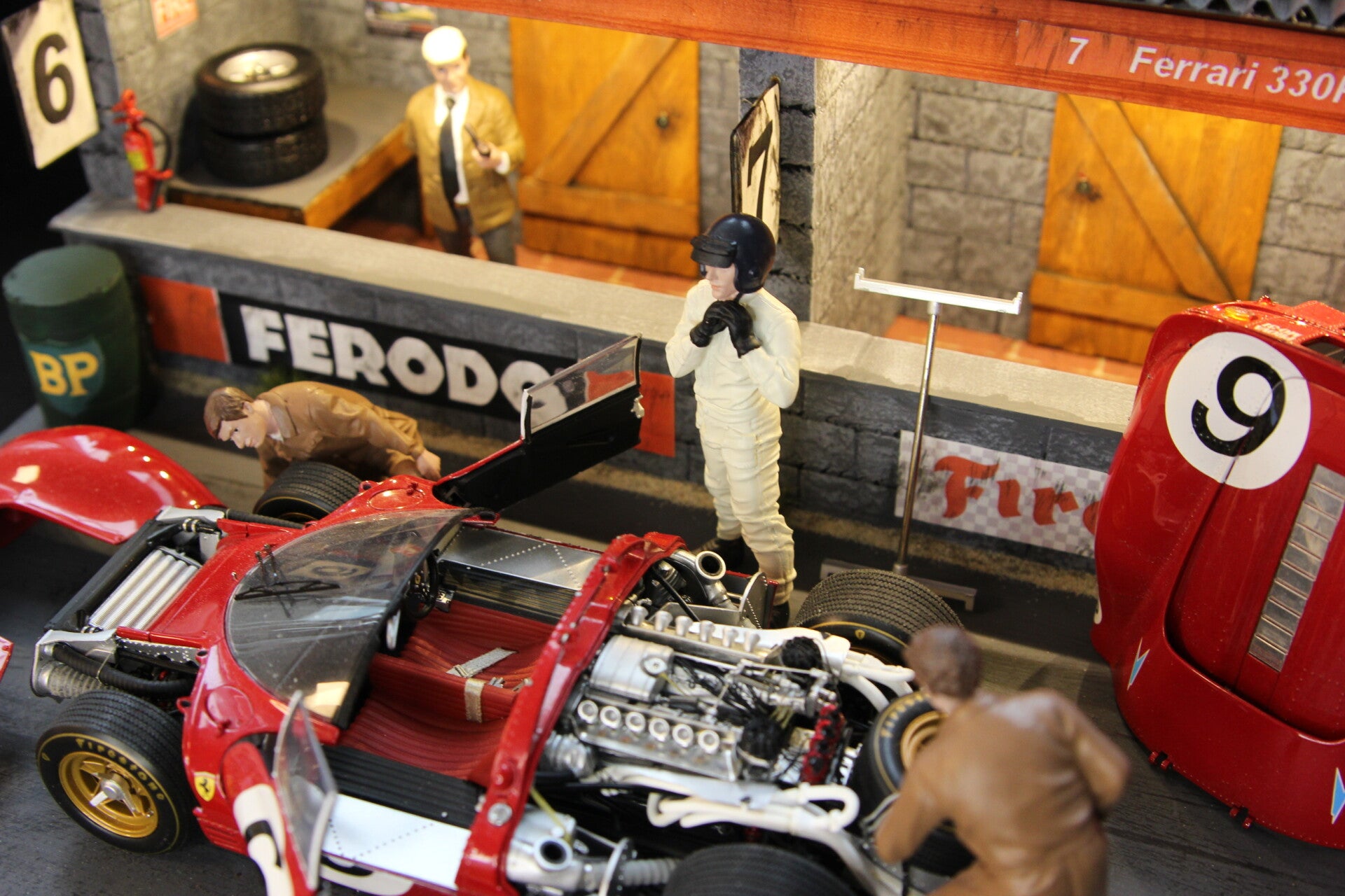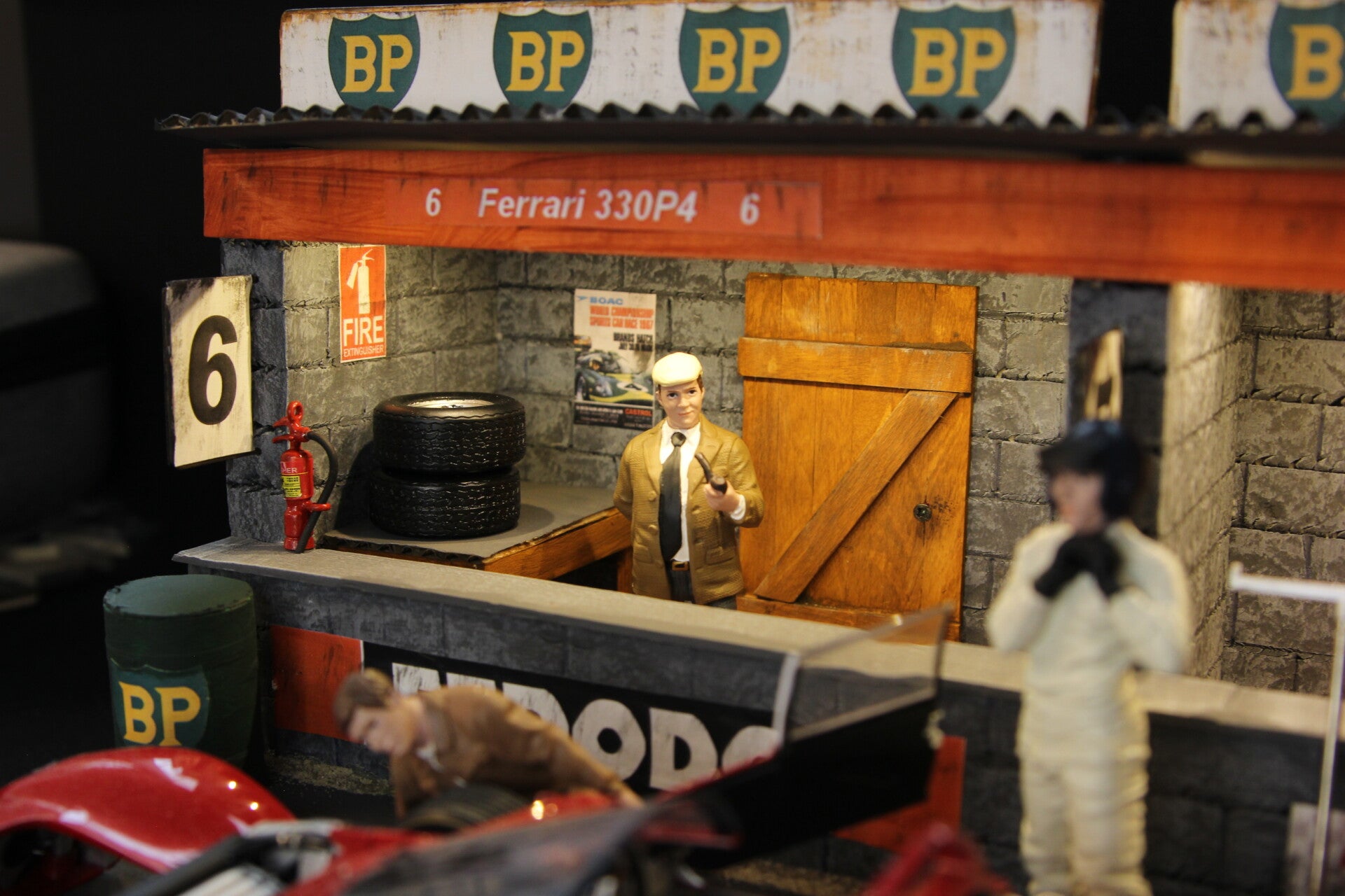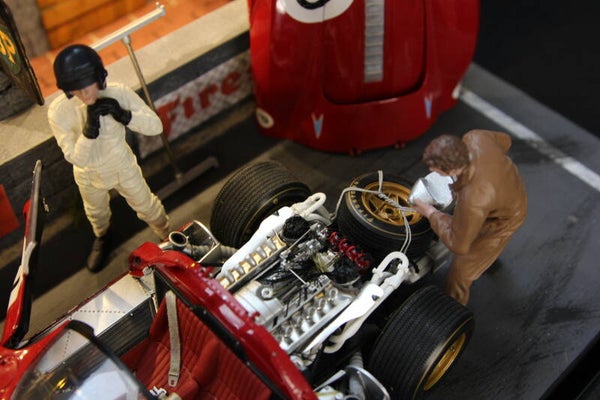 Ook de figuurtjes van de teambaas, de coureur en de 2 monteurs alsmede diverse accessoires worden met het diorama meegeleverd.