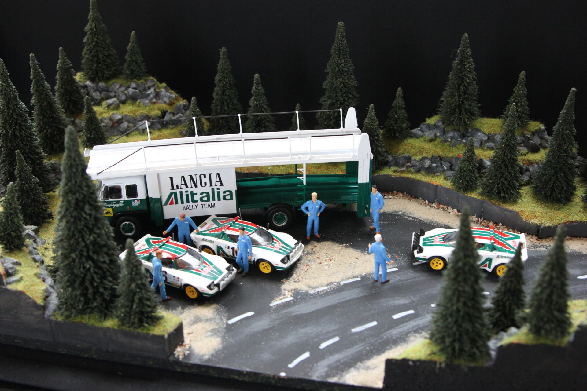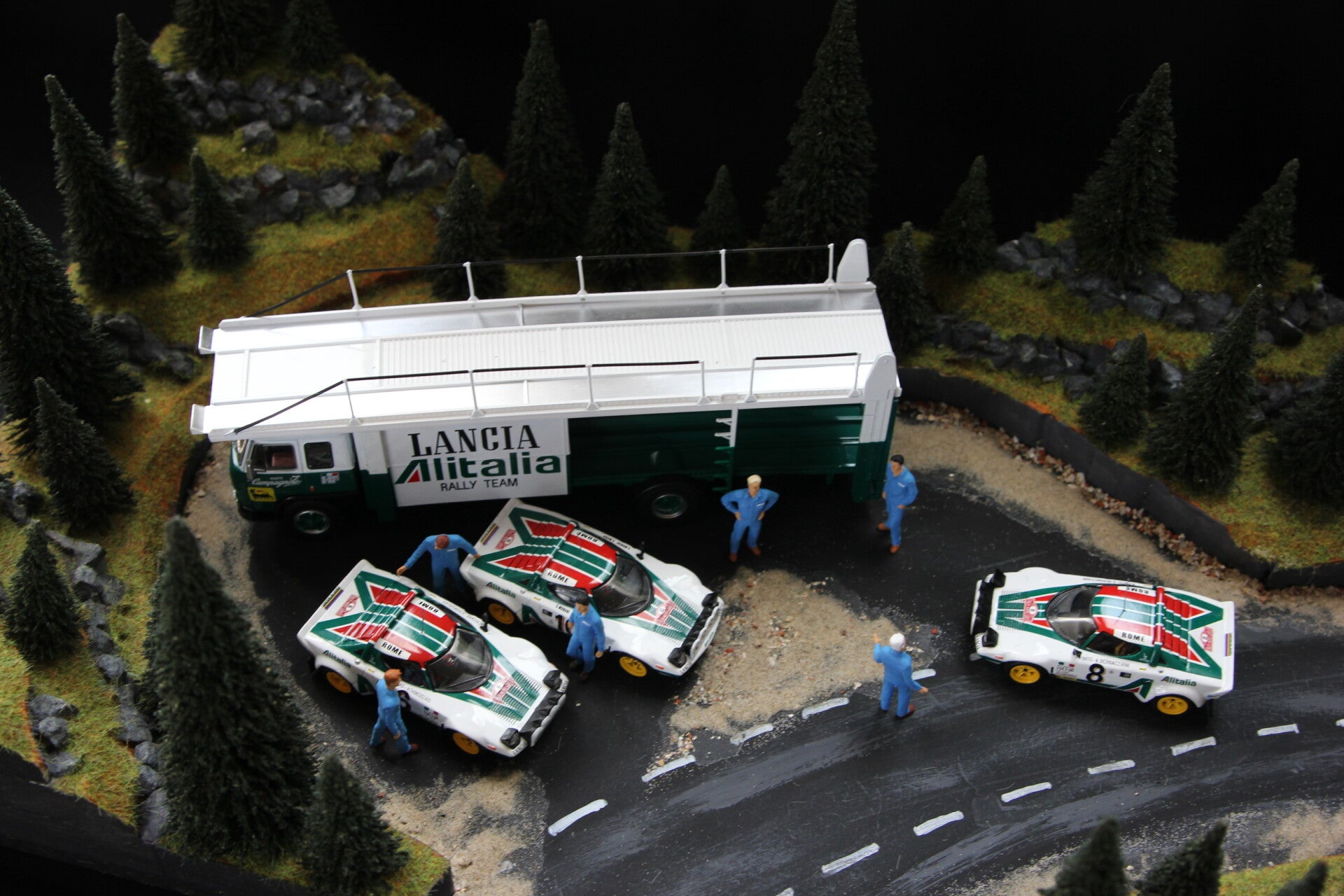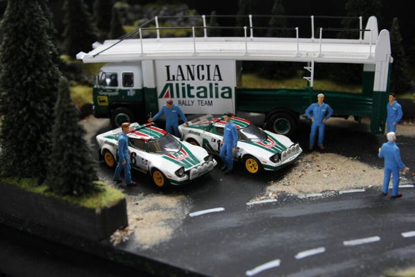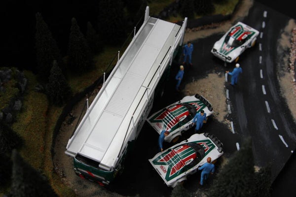 This diorama comes complete with the team transporter, the 3 Lancia Stratos cars and 6 mechanics.