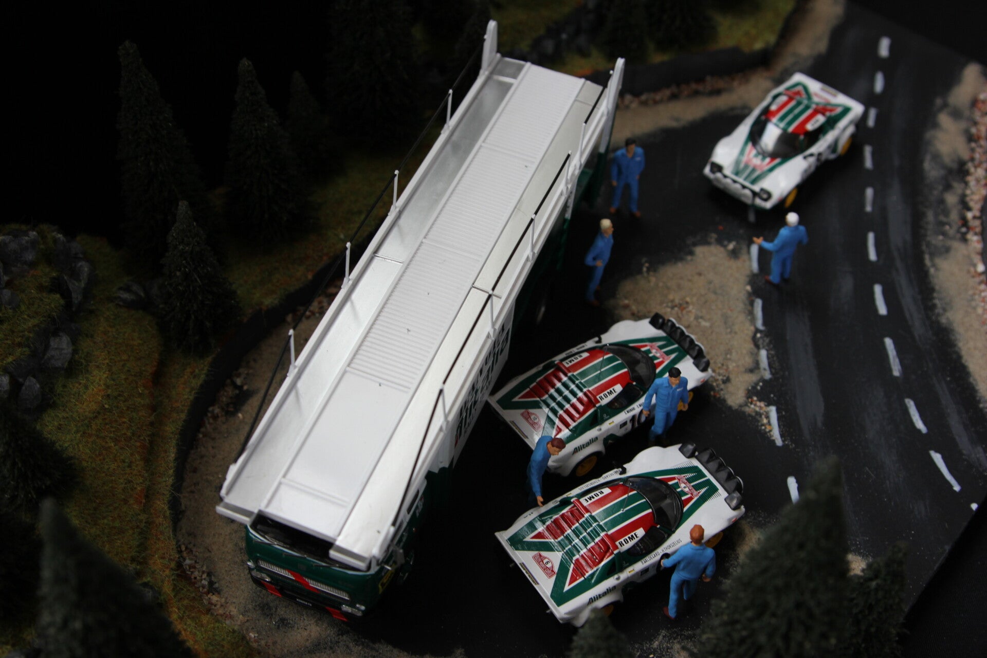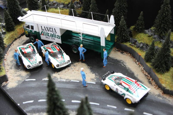 Beautiful hand made diorama of the shake down test of the Alitalia Lancia Rally team during the rallye the Monte-Carlo in 1976